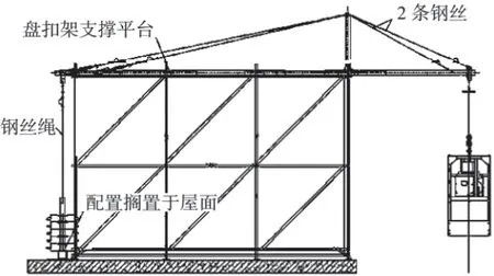 当屋面仅为少部分女儿墙较高(或少许外立面局部超出屋面较高),可直接在屋面搭设脚手架支撑平台,将吊篮横梁固定于平台上,吊篮后臂仍需按照常规方式设置配重,如图5 所示。支撑平台纵横立杆间距、水平杆步距需进行受力验算,确保支撑平台的承载力和稳定性。