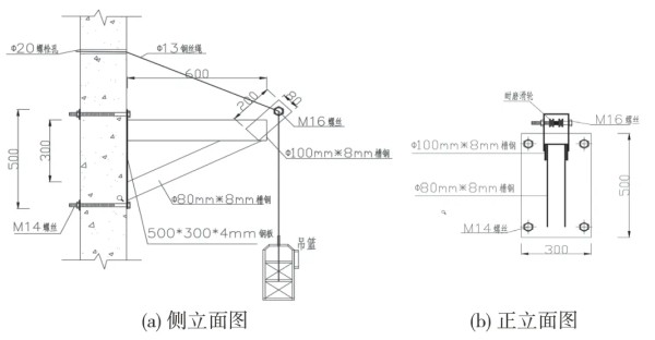 牛腿支架采用两根槽钢及钢板焊接形成三角形支架,钢板上预留4 个M14 螺栓孔,以便在剪力墙上固定。在槽钢悬挑端端部焊接安装钢丝绳的固定环,钢丝绳和固定环之间设置柔性防磨垫圈,减少钢丝绳的磨损(图7b)。