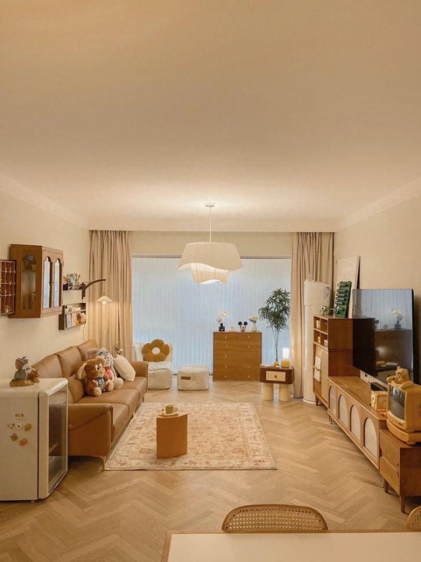 客厅墙面刷了奶黄色的乳胶漆,吊顶用石膏线做了一圈边吊,地面铺温馨的暖木色地板,用一盏南瓜主灯点亮了客厅空间。
