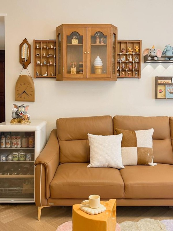 沙发背景墙上布置了复古镜、展示柜、置物架、杂志架,屋主收藏的手办整齐地摆放在柜子上,也成为了家里一道亮丽的风景线。