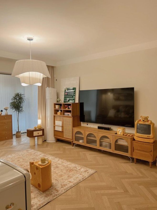 电视机悬挂在客厅的中间,屋主喜欢追剧、看电影、玩游戏,电视机也给她的生活带来了很多乐趣。
