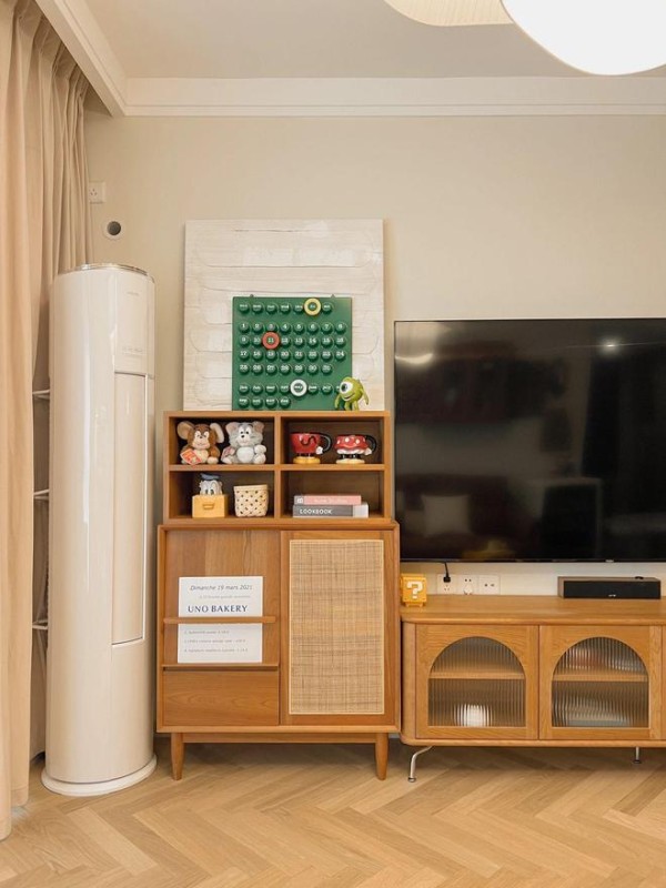 电视柜是组合式设计,左侧是“中柜+展示柜”,中间是较长的矮柜,右侧又补充了一组小柜子。