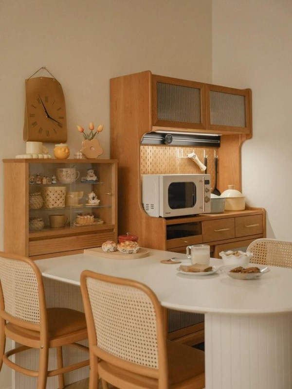 餐桌的内侧放置了一组复古风餐边柜,这款也是屋主精心挑选的,是现在很流行的款式,兼具了储物、展示、吧台等多种功能。