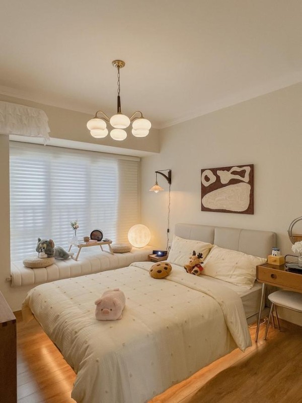 飘窗定制了海绵软垫,并布置了小桌和靠垫,坐在上面赏景、品茶,真舒服啊!屋主舍弃了一组床头柜,用梳妆台代替,功能更加实用。