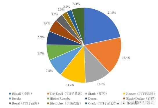 根据中金企信的统计数据,2022年美国吸尘器销量达到3,886万台,2017-2022年间年均复合增长率为1.76%。美国吸尘器市场呈现充分竞争的形态,主要龙头企业市场份额占比较高。其中,创科集团(TTI)市场份额占比合计达到33.6%,其旗下品牌如DirtDevil、Hoover、Royal、Oreck等皆占据较大份额,分别达到16.4%、11.4%、3.6%以及2.2%。其他主要吸尘器销售企业如必胜(Bissell)、鲨客(Shark)市场份额占比分别约为21.6%、11.3%。
