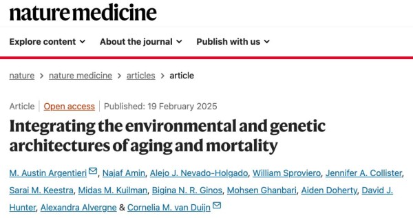 2025 年 2 月 19 日,牛津大学的研究人员在国际顶尖医学期刊 Nature Medicine 上发表了题为:Integrating the environmental and genetic architectures of aging and mortality 的研究论文。