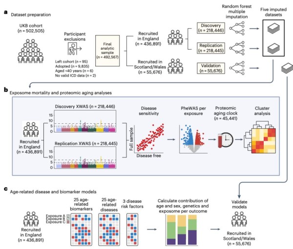 在这项新研究中,研究团队使用了来自英国生物样本库(UK Biobank)近 50 万参与者的数据,评估了 164 项环境因素和 22 种主要疾病的遗传风险评分对衰老、年龄相关疾病和过早死亡的影响。研究团队利用血液蛋白质水平来监测人们衰老速度,量化环境因素和遗传因素对衰老的相对影响,提供了迄今为止最全面的关于导致衰老和过早死亡的环境和生活方式因素的概述。