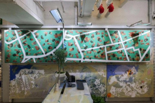 经由地球艺术作品走进店内,首先映入眼帘的便是安踏邀请青年艺术家们共创的天马行空的艺术空间,来自不同领域的艺术家、设计师们利用安踏旧库存面料进行创作,用自己的艺术语言表达对可持续议题的思考。环顾店内,全店色彩斑斓的墙面背板,仔细看,也是由安踏库存旧面料、边角料加透明的环保树脂胶制成。