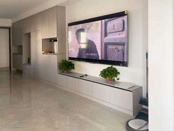 客厅空间较大,整个电视墙面做了一整面定制柜体,完美解决储物问题,根据位置也划分不同的功能使用,分别是鞋柜、储物柜和电视茶几,美观实用上档次,为了不让空间显得太过压抑,电视位置选择了留白。橱柜设计无把手设计,简单时尚。
