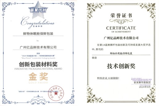 凭借在锁鲜技术领域的创新与突破,公司荣获多项行业殊荣,包括: 第14届美狮杯包装创新及可持续发展大奖评选“技术创新奖”;