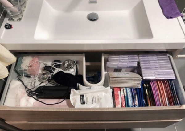 洗漱柜可以做成悬空的,下水管道做墙排,这样就没有卫生死角了。洗漱柜的内部就可以放一些备用的卫生用品(毛巾和牙刷等),洗漱柜下面可以放盆(有小朋友的家,盆还是挺多的)。