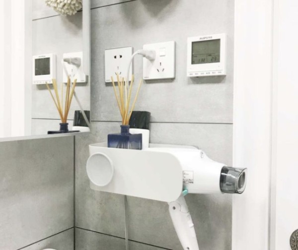 靠着洗漱台的墙面还可以加以利用,吹风机架可以放置吹风机,这样就不会到处找吹风机了,也不用担心电线绕起来打劫了,还可以安装牙刷置物架和单杆毛巾架。