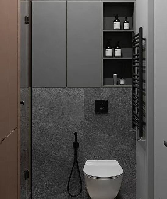 卫生间的下水管道,可以利用起来做成壁龛,打扫起来会很方便,摆放洗浴用品还是很不错的。马桶这部分的空间也是可以利用的,两侧有空间的,那么可以放移动置物架。