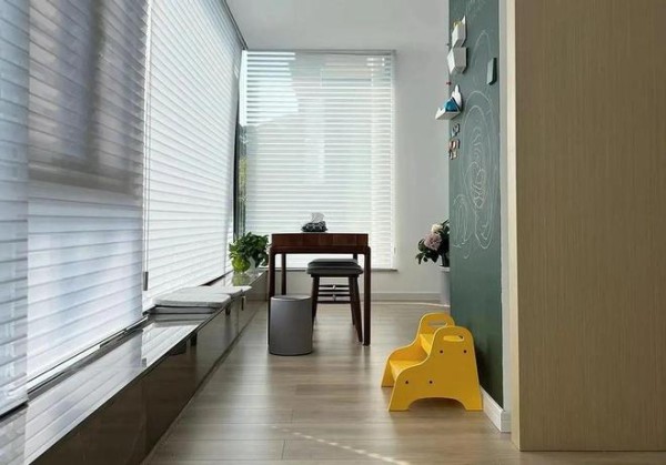 家里有孩子的,可以实现孩子的活动区,铺上爬行垫就可以了。如果想要书房,在这个地方,摆上书桌,也是个不错的学习区。