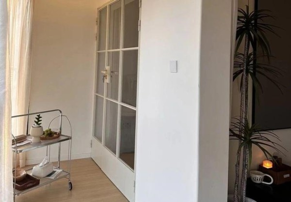 第一个区域的阳台不封闭,做成敞开区域。这个区域与室内使用一道推拉门封闭。