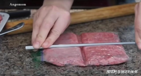 可以用自封袋封好后,用擀面杖把肉末擀薄,均匀塞满整个自封袋,然后用筷子在中间压个"十"字,每次做菜需要用到肉末的时候,比如做个肉末茄子或者麻婆肉末豆腐,就取走一小块,真的超级方便。