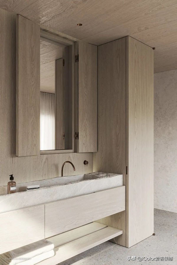 把大面积的浴室柜改为独立的洗脸台盆柱,把四角的收纳柜变为悬空处理,增加视觉空间,也便于后期打扫,在淋浴区的淋浴花洒附近、马桶区的马桶后方墙面空间、还有洗漱区增设壁龛,都可以大大增加收纳空间。