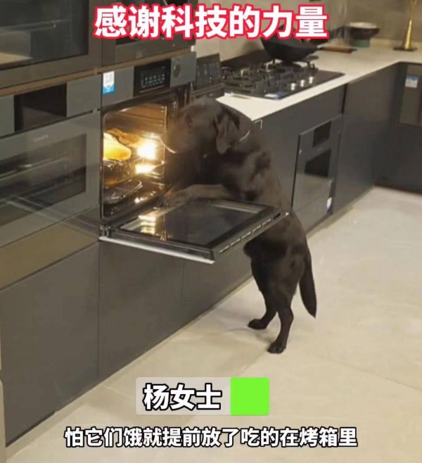 她提前已经将食物放进了烤箱,等到该吃饭的时候,她就拿着手机远程操控打开烤箱。狗狗看到烤箱开了就会去取食物吃。