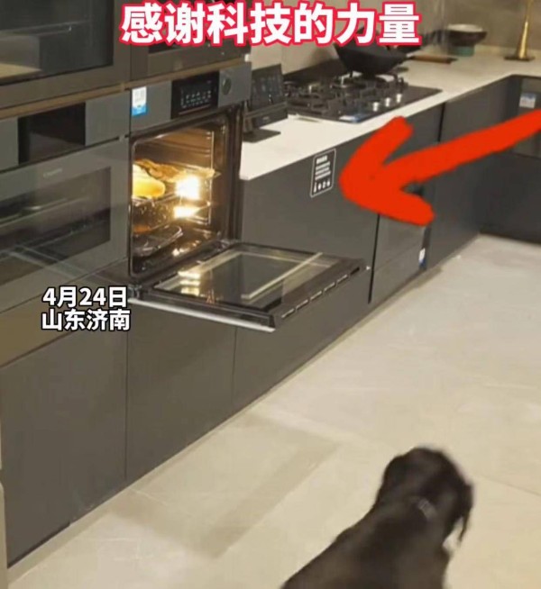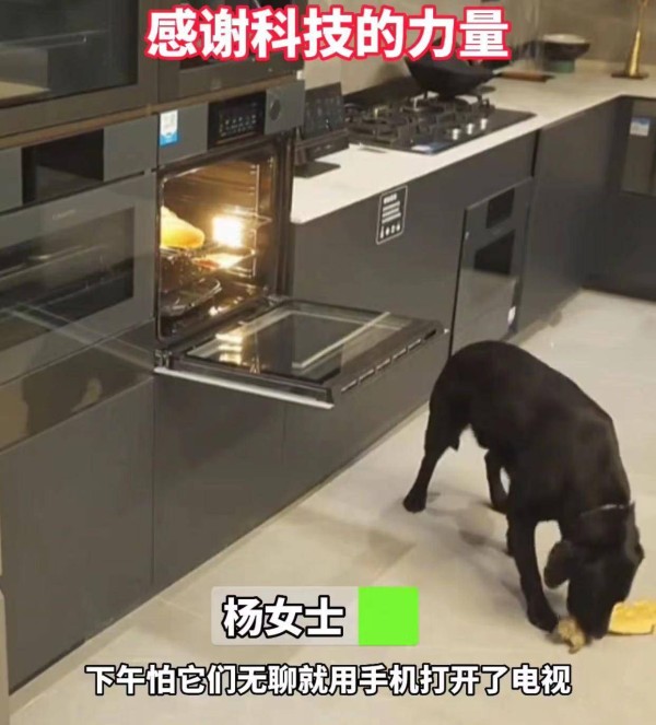 然后她看到狗狗取出食物后,再远程操控着关上烤箱的门。甚至还能远程操控着烤箱加热、停止等。