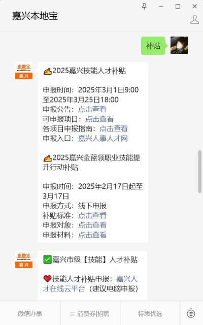 温馨提示:微信搜索公众号【嘉兴本地宝】,关注后在对话框回复【补贴】,即可获取2025嘉兴技能人才补贴申报公告、申报项目、申报入口、申报指南和更多相关信息。