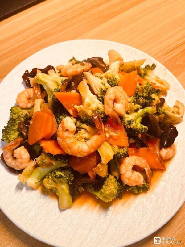 3、起锅烧油,油热放入虾仁,翻炒至虾仁变色,放入焯好水的西兰花和木耳,淋入调好的料汁,大火翻炒均匀即可出锅。