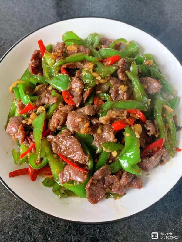 2、起锅烧油,油热放入辣椒,加入少许盐,小火翻炒至断生盛出。锅留底油,油热放入腌制好的牛肉,翻炒至变色,放入姜片、蒜末、泡椒、小米辣,翻炒出香味,放入炒好的辣椒,加入1勺生抽,翻炒均匀即可出锅。