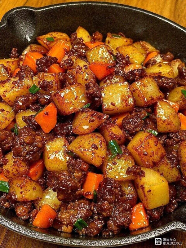 2、起锅烧油,油热放入土豆丁,小火煎至表面金黄,捞出控油。锅留底油,放入牛肉末,翻炒至变色,放入葱花、姜末、蒜末,煸炒出香味,加入1勺料酒、少许老抽,翻炒至上色。