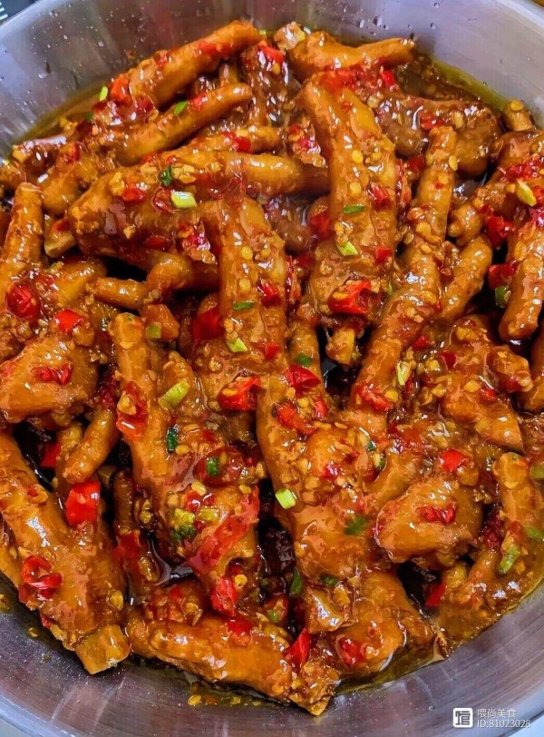 2、起锅烧油,油热放入蒜末、小米辣,煸炒出香味,倒入鸡爪子,翻炒均匀,加入1勺生抽、少许老抽、1勺蚝油、1勺胡椒粉、少许白糖,大火翻炒均匀,撒上葱花即可。