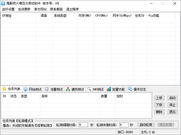 鬼影防火墙压力测试软件v8是目前最新的免费版本,该版本在原来的优秀基础上,增加了数十项领先功能。在软件功效,用户体验等方面有了极大的改进。比如修复部分BUG,优化服务端,主控端,稳定不掉鸡,改善了传统攻击软件的内核缺陷,减少了占用资源等问题,并加入全新变异代码,穿透率极强,新增多任务轮回功能,欢迎免费下载。