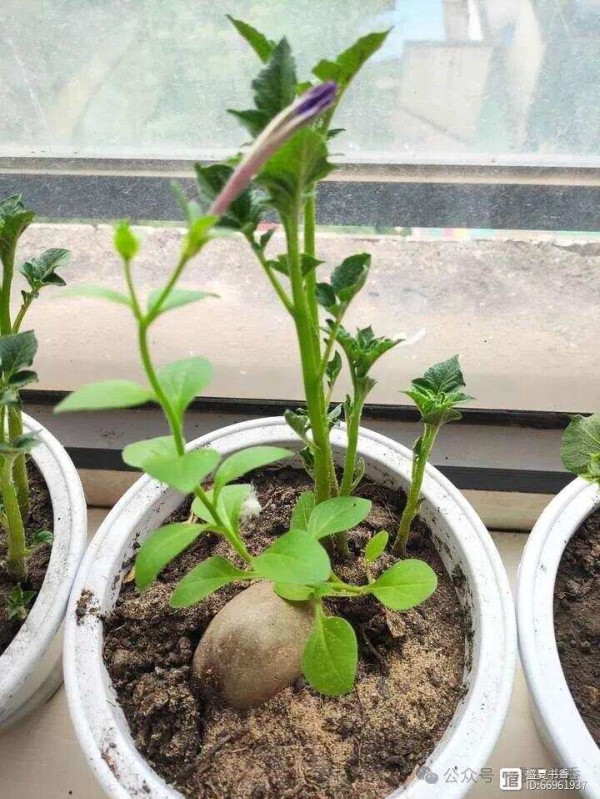 去年的土豆开的是白花,土里也会长出一些新鲜的好小的土豆,如果盆大一些,估计会长得更大吧。