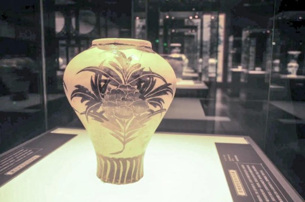 在湖南省博物馆“瓷之画——从长沙窑到醴陵窑”展厅中,陈列有一件“白地绘划花牡丹纹罐”,器物的肩腹部绘有剪影式的大折枝牡丹,花形饱满鲜明、枝叶飘逸生动,具有典型的民间艺术风格和极强的感染力,充分显示了磁州窑瓷器的艺术特点,是一件难得的代表之作。