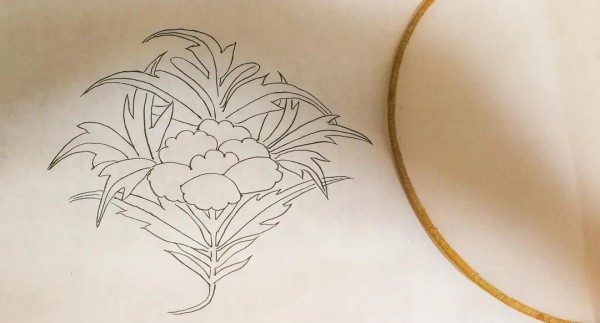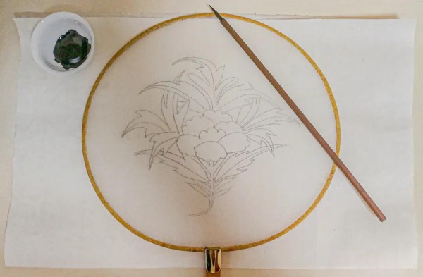 步骤二:把空白团扇盖在已经画好了的底稿上,用勾线笔在团扇上描出图案。