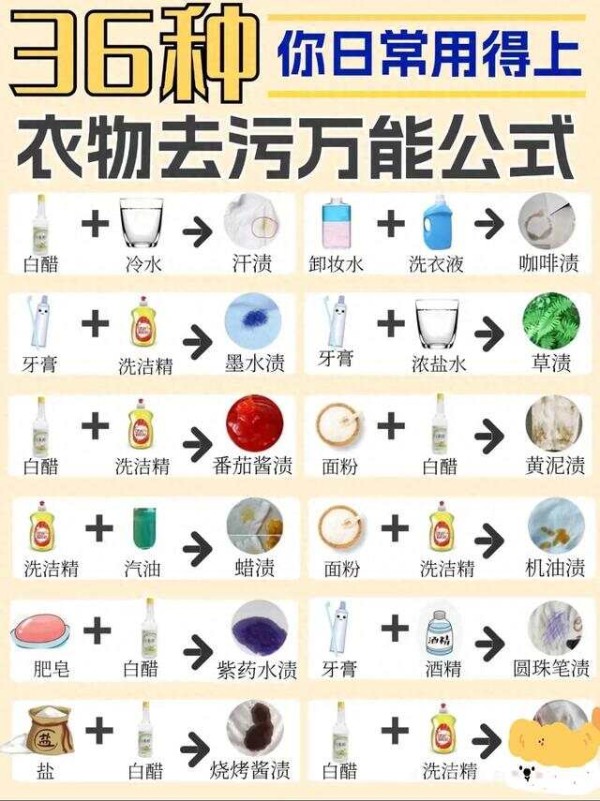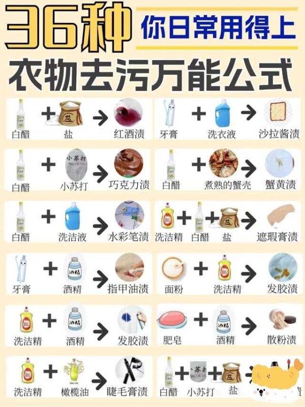 汗渍尴尬,白醋掺冷水,泡完清爽;咖啡渍难搞,卸妆水混洗衣液。 墨水渍用牙膏加洗洁精;草渍拿牙膏和浓盐水,搓搓就掉。 番茄酱渍别慌,白醋配洗洁精;黄泥渍用面粉加白醋。 蜡渍找洗洁精和汽油;机油渍靠面粉混洗洁精。 紫药水渍用肥皂加白醋;圆珠笔渍拿牙膏兑酒精。 烧烤酱渍别愁,盐和白醋来帮忙;还有各种奇怪污渍,都有对应的“公式”!