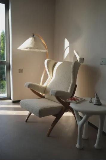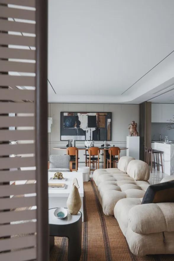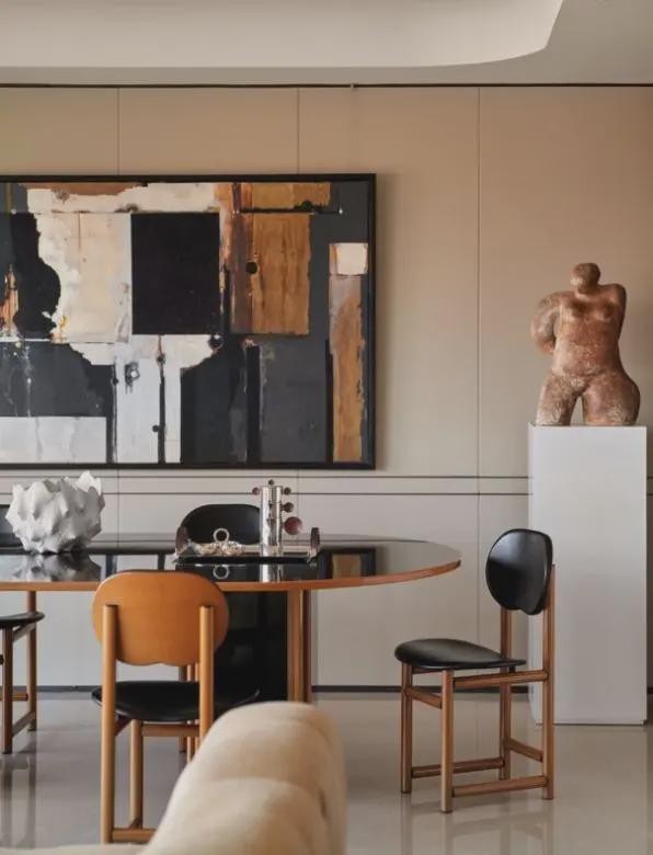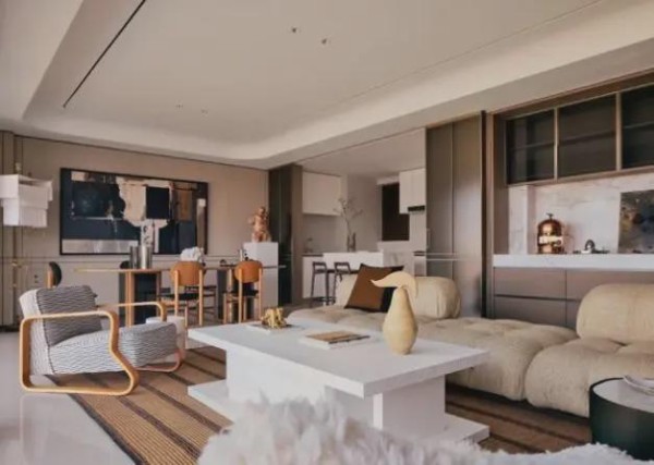 样板间的设计本身就是「静谧与光辉」的具象:约8.8米江景会客厅的窗前,黄浦江景如一幅流动画卷,成为展览最天然的“动态展品”;室内以米白、暖棕为主调,搭配原木纹理的家居艺术品,营造出「静谧」底色;而设计师精心布置的灯具,在夜晚与窗外霓虹、粼粼波光相呼应,形成「光辉」的对话。