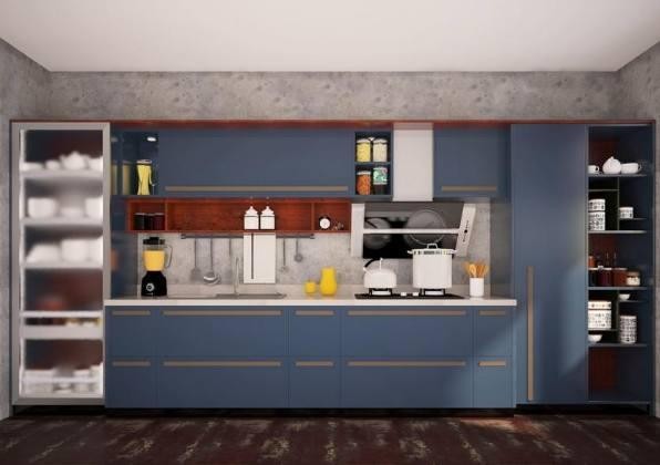 蓝色的整体橱柜为空间增色不少,厨房亮点之处在于空间收纳功能的最大化,将大量的厨房用具和厨房家电“藏匿”于隔板中。一字型橱柜,立柜、顶柜、地柜完美拼接,形成一个回型,整体厨房装修更为美观。