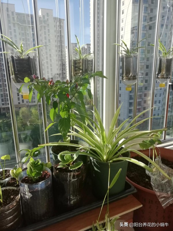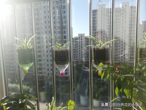 饮料瓶子可以养吊兰,或者养扦插成活的小苗,可以做成水培绿萝,悬挂起来,阳台还不占地方。