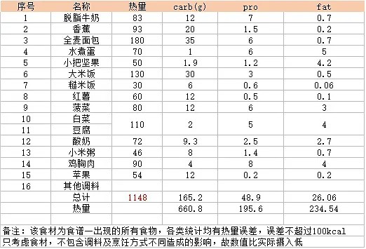 一天的饮食就结束了,不要忘了每天饮用1500-1700ML的水;每日摄入额外的食用油不超过三勺(包含炒菜使用),盐不超过6g。下表为上面所有涉及到的食材的详细数据,仅供参考,该饮食计划是基于最开始所说的符合那些条件的特定人群,摄入量大约在1200-1500大卡,这个值仅为估计值,具体到个体,需要根据不同情况进行调整。