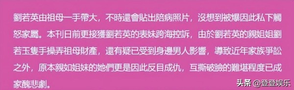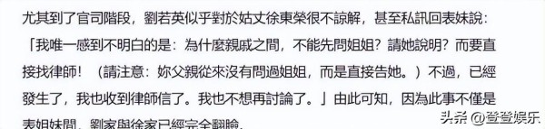 但是,一则令人震惊的消息:刘若英和姐姐刘若玉被姑父提告,指控她们串通霸占失智祖母的房产。事件的核心是祖母名下的一处房产,这座房产在祖母失智后被转移到刘若玉名下,价格远低于市价。姑父和表妹对此表示强烈不满,认为这其中存在欺诈和不正当行为。