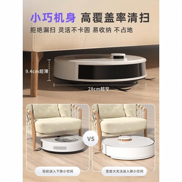 1️⃣ 超薄设计便于清扫:机身纤薄,不论是家具底部还是狭窄空间,轻松进入每个角落,有效清除灰尘与杂物。这个设计让清洁变得无死角,让家居保持整洁无虞。