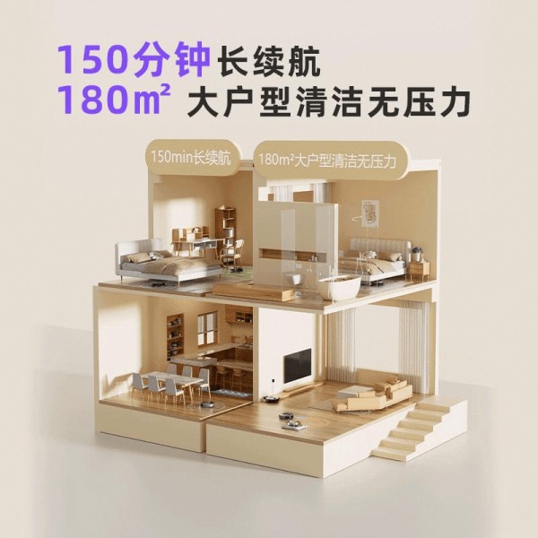 3️⃣ 超长续航时间:内置大容量电池支持150分钟的持续工作,能够轻松应对大户型的清洁需求,不用担心频繁充电带来的麻烦,清洁更加连贯。