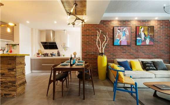 客厅一般以暖色为主色调,充满美式元素的客厅吊顶或是简单工业台灯都能让空间简单大方。为避免单调,多数家庭都会在地面上墙壁上大做文章,比如条纹清晰的地毯和色彩强烈的壁画,简美就是去掉繁复又不空洞,宽敞的空间布局让人更加舒畅。