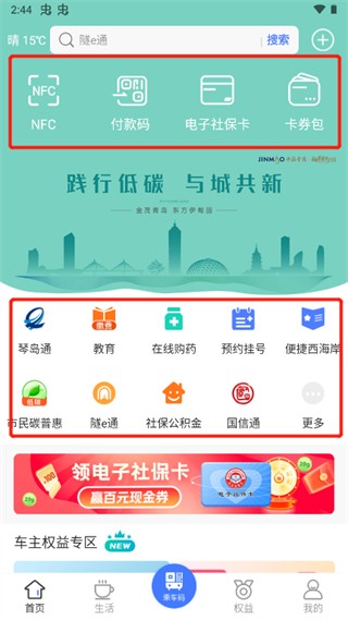 2、在首页中我们可以看见教育、在线购药、社保公积金、预约挂号等服务,你可以根据你的需求选择使用。并且,还拥有NFC、付款码、电子社保卡等功能,可以说是非常的全面。