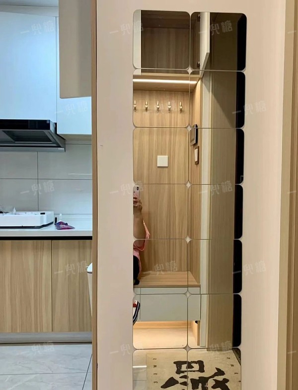 这种镜子一般以正方形为「基础单元」,可以像积木一样,拼成自己喜欢的形状,在墙壁、柜面等地方,组合贴出创意型的镜子。