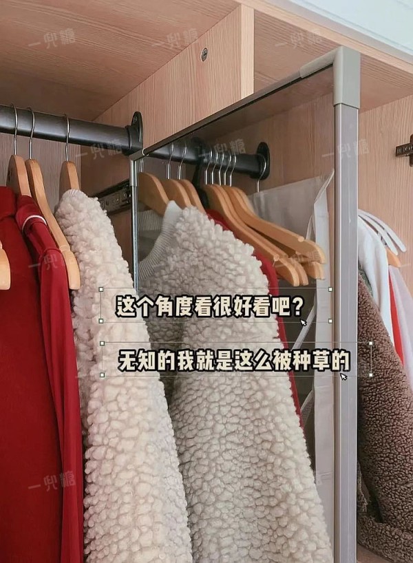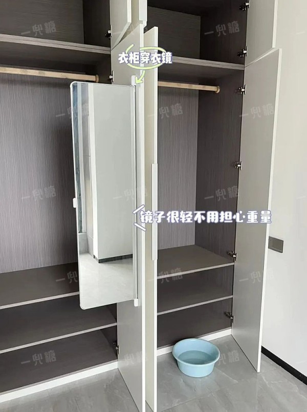 为了避免上面这些缺点,还有一种设计是在「衣柜中」安装可伸缩穿衣镜。镜子背面通过五金件与柜体连接。用的时候将镜子拉出来就行。