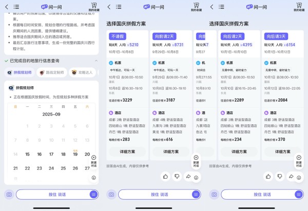 更长的假期和更多的目的地也会大大增加旅行规划的工作量,比如需要更多地考虑行程衔接,为了错峰要反复切换日期和比价,法定假期与非法定假期的景区政策不同等。如今有了AI能力的加持,不仅行程可以按照用户需求规划得妥妥帖帖,不同方案的预算和性价比也可以直观对比和选择。