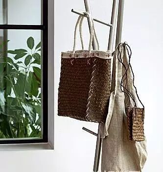 衣架,除了悬挂衣物外还可以挂上实用的环保袋。当然,材质越天然越好,藤编的手提袋坏了,在上面缝上一块儿麻布就可以再次使用;旧衣服不穿了,重新剪裁后就又做成环保的布袋,将它们挂在衣架上,可以用来收纳小件物品。