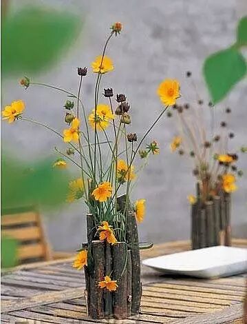 为了树木长得更加旺盛健康,每年到了一定的季节,就会有专人为树木修剪枝杈。而剪下来的枝杈中,不乏姿态优美的,不如捡回几枝,刷上喜欢的颜色,做干枝装饰,或者,锯成长短不一的木条,粘或钉在一起,中间错落地夹几只旧瓶子,比起普通的花器,树枝花器搭配野花干枝别有一番自然野趣。