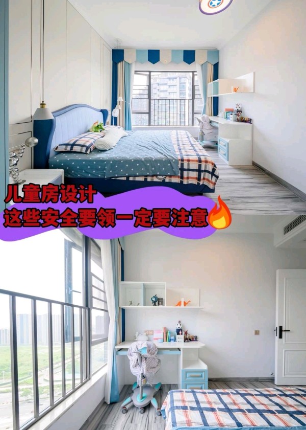 儿童房装修一直是一门大学问呢!稍微不注意,就会出现很多安全隐患,造成入住后的重重困扰,为了保证孩子的健康成长,儿童房设计一定要做到的安全问题有: 1、电源插座要有保护套或选用儿童安全插座。 避免孩子用手去抠电源插座,或者用棍子之类的东西插玩,容易造成触电,所以一定要装专用的保护套,或选用自动断电功能的插座产品能有效防触电 2、窗户安装指纹锁或限位器。 指纹锁或限位器,可以有效避免孩子随意开窗或开大窗户,造成掉落的安全问题。 3、灯光设计一定要注意防蓝光。 根据国标防蓝光危害评估表能看出,RG0标准可免除危险,有效防蓝光,不伤眼。灯光设计做得好,有利用孩子从小视力的健康发育哦~ 4、最大限度选用环保材料装修。 儿童对于大人来说,抵抗力更弱,所以空气当中所含有的甲醛等有害气体会对儿童会产生更大的影响,尤其是对于婴幼儿来说,安全隐患更大。 5、避免选用尖锐边角的家居。 选购家具的时候尽量避免带有尖锐的方角结构,圆角造型的家具让人感觉更亲切,也可以防止小孩不小心磕碰,导致受伤。如果儿童房的家具有带方角的话,安装防撞贴很重要。 为了给孩子一个健康的成长环境,这五点安全问题,在装修儿童房的时候,一定要注意哦,装修安全隐患做好了,能减少很多入住后的居家问题呢~ #儿童房