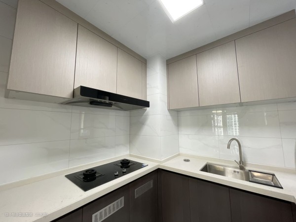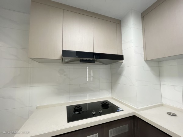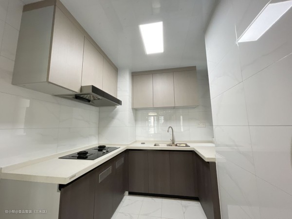 像这种,厨房唯一采光处只在水槽右边的位置上,前方还有一堵墙挡住光线的进入,毫无疑问选用浅色砖是最好的,墙面选用20*40cm的白色抛光砖,浅色不耐脏更易于卫生打理。