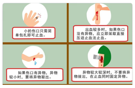 点击左上方蓝字 关注濉溪县医院订阅号 日常生活中,扭伤、挫伤、伤口出血、烧、烫伤之类的事有时无法避免。较严重的伤口或肢体创伤如果没有得到及时处理,几小时之内可能就会引起感染或出现功能障碍等并发症。适当的处理则能减少并发症的发生。一、擦伤、割伤 如果仅是擦伤或表皮割伤,可先用生理盐水清洗伤口(如条件有限可用清水),再用碘伏等擦涂在伤口上,然后用创可贴包好伤口。隔1-2天打开观察,并用碘伏等消毒创面。如果伤口较深,流血较多,用无菌纱布紧紧地压住伤口。 什么时候该去医院?1、压住伤口时间超过5分钟仍未止血;2、被动物或人咬伤出血的;3、伤口很深或者划开了口子;4、被玻璃或金属嵌入、扎入;5、不感到伤口疼,有可能已伤了该处的神经;6、伤处活动受限,有可能肌腱损伤;7、伤口红肿热痛,有脓液,出现感染的迹象。邮箱:380507208@qq.com